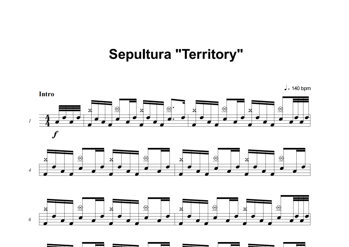 《Territory》是Sepultura演唱的一首歌曲,这份架子鼓谱共有七张高清图谱,图谱由 @庄颜 编配上传,图谱使用五线谱编配,使用这份Territory架子鼓谱,你将能够轻松地敲打出这首Sepultura的Territory,快来尝试吧。