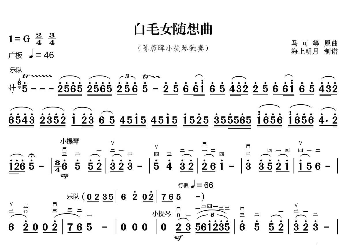 《白毛女随想曲》是陈蓉晖演奏版演唱的一首歌曲,这份小提琴谱共有三张高清图谱,图谱由 @海上明月 编配上传。