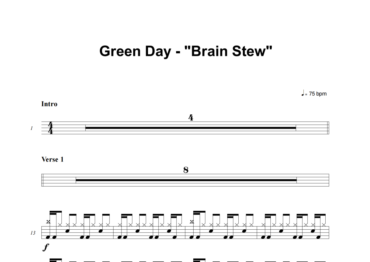 《Brain Stew》是Green Day演唱的一首歌曲,这份架子鼓谱共有三张高清图谱,图谱由 @积极处世 编配上传,图谱使用五线谱编配,使用这份Brain Stew架子鼓谱,你将能够轻松地敲打出这首Green Day的Brain Stew,快来尝试吧。