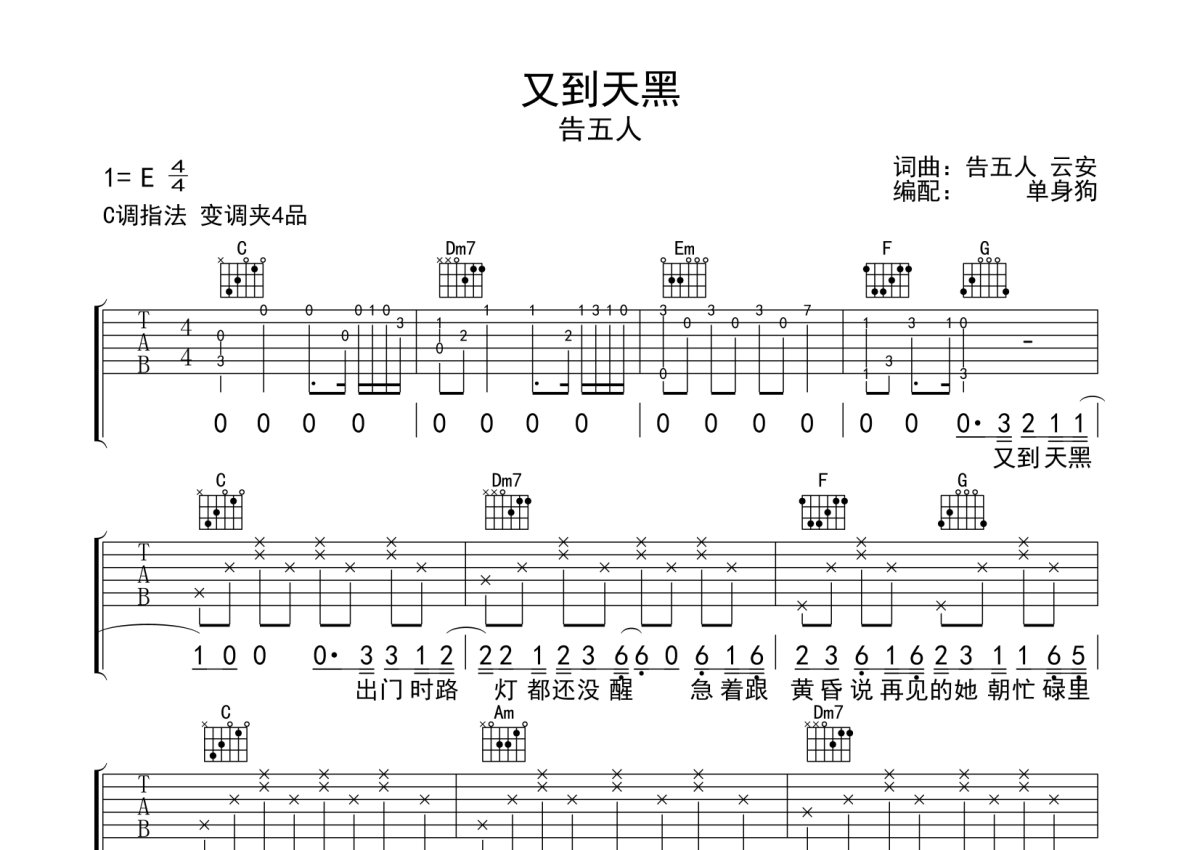 告五人《又到天黑》吉他谱 - C调弹唱六线谱