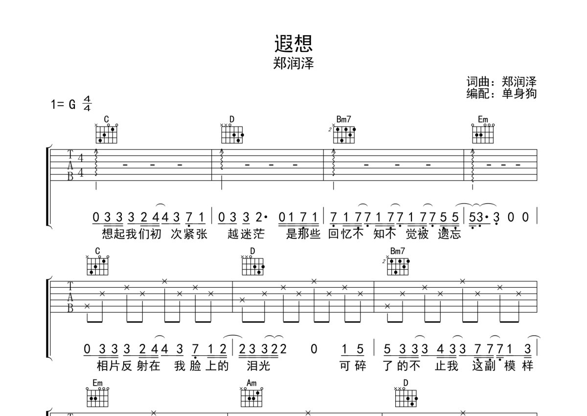 郑润泽《遐想》吉他谱 - G调弹唱六线谱