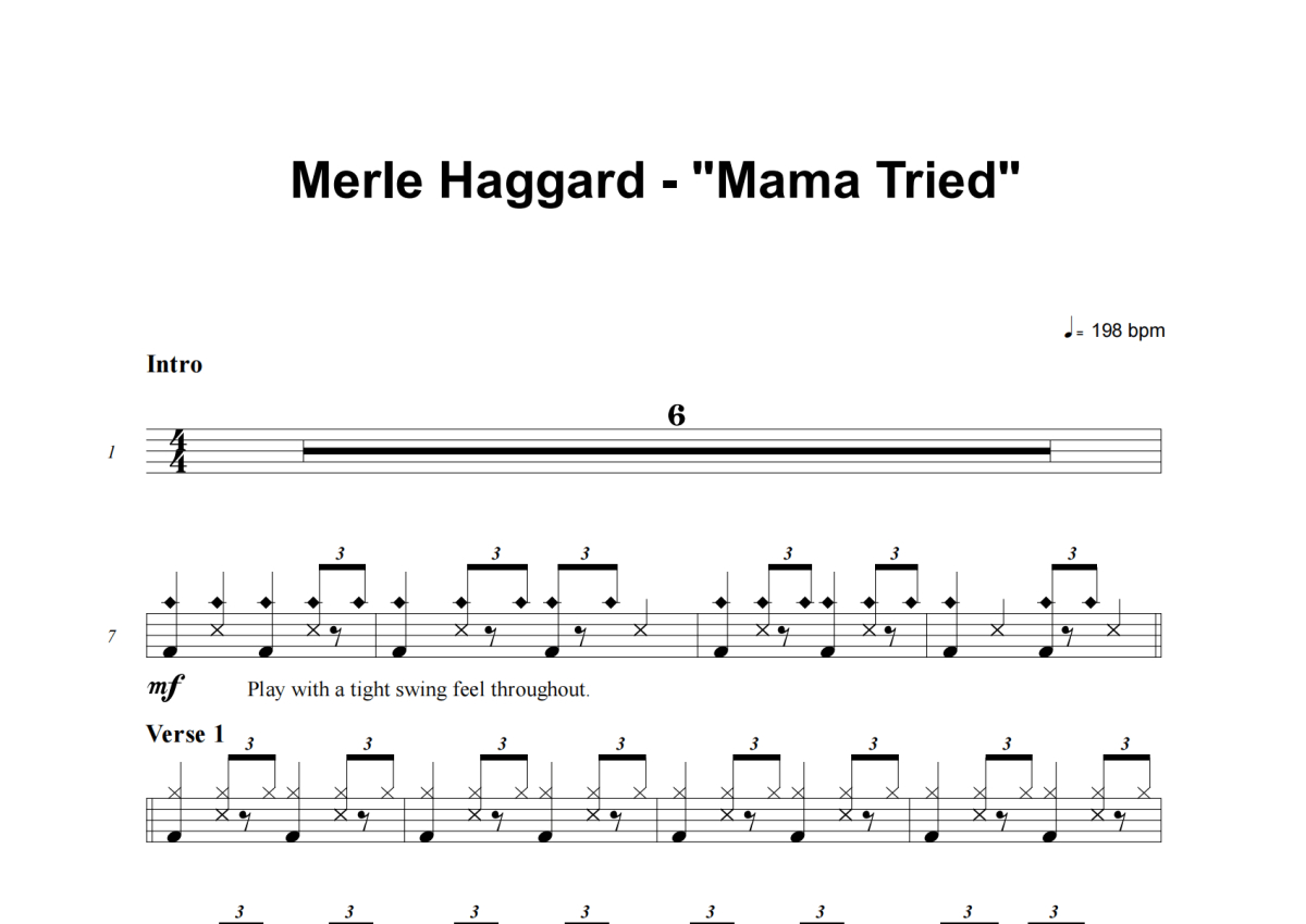 《Mama Tried》是Merle Haggard演唱的一首歌曲,这份架子鼓谱共有三张高清图谱,图谱由 @积极处世 编配上传,图谱使用五线谱编配,使用这份Mama Tried架子鼓谱,你将能够轻松地敲打出这首Merle Haggard的Mama Tried,快来尝试吧。