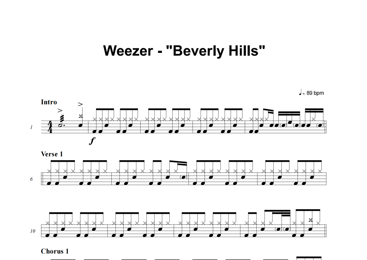 《Beverly Hills》是Weezer演唱的一首歌曲,这份架子鼓谱共有三张高清图谱,图谱由 @积极处世 编配上传,图谱使用五线谱编配,使用这份Beverly Hills架子鼓谱,你将能够轻松地敲打出这首Weezer的Beverly Hills,快来尝试吧。