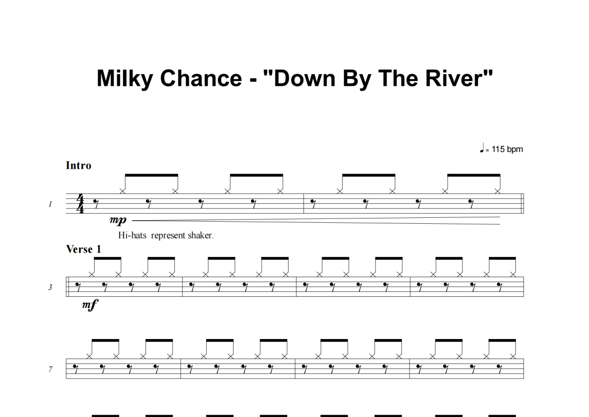 《Down By The River》是Milky Chance演唱的一首歌曲,这份架子鼓谱共有三张高清图谱,图谱由 @积极处世 编配上传,图谱使用五线谱编配,使用这份Down By The River架子鼓谱,你将能够轻松地敲打出这首Milky Chance的Down By The River,快来尝试吧。