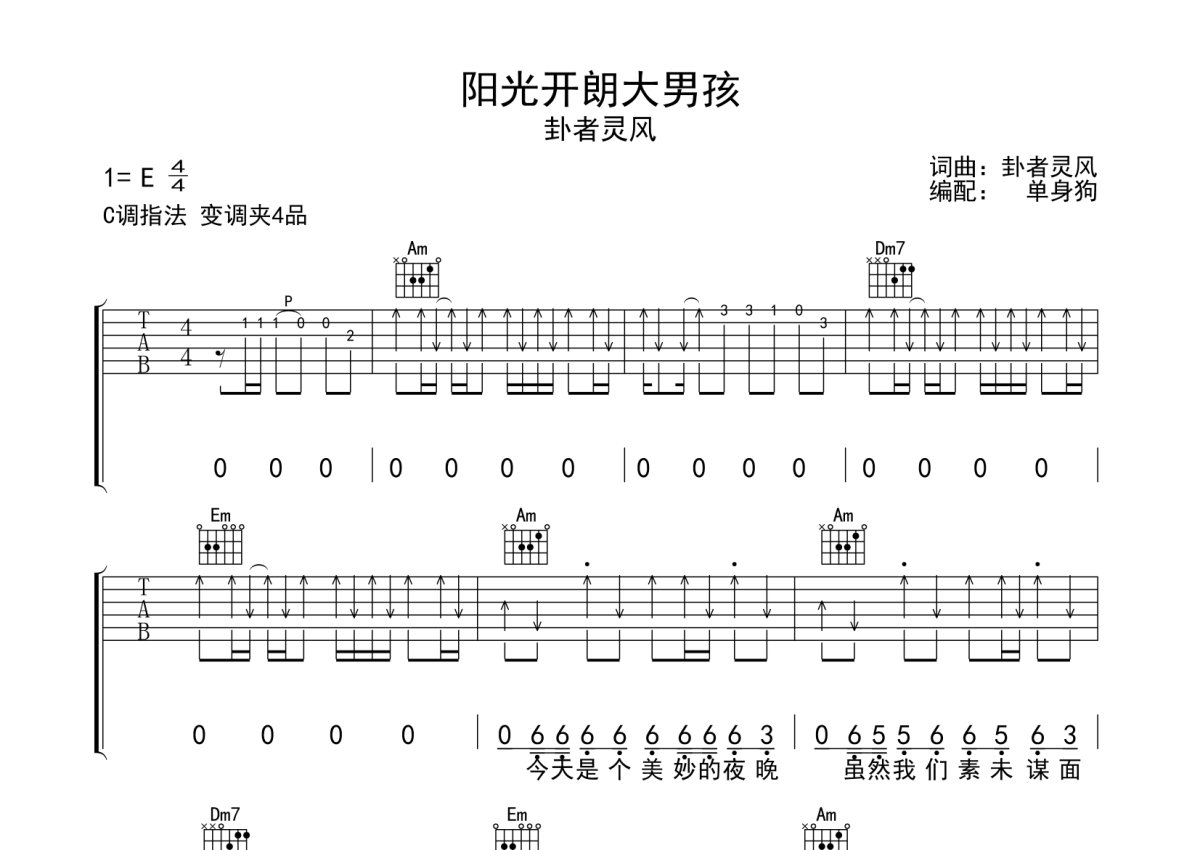 卦者灵风《阳光开朗大男孩》吉他谱 - C调弹唱六线谱