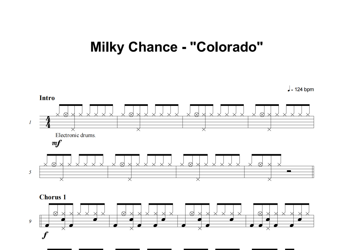 《Colorado》是Milky Chance演唱的一首歌曲,这份架子鼓谱共有三张高清图谱,图谱由 @积极处世 编配上传,图谱使用五线谱编配,使用这份Colorado架子鼓谱,你将能够轻松地敲打出这首Milky Chance的Colorado,快来尝试吧。