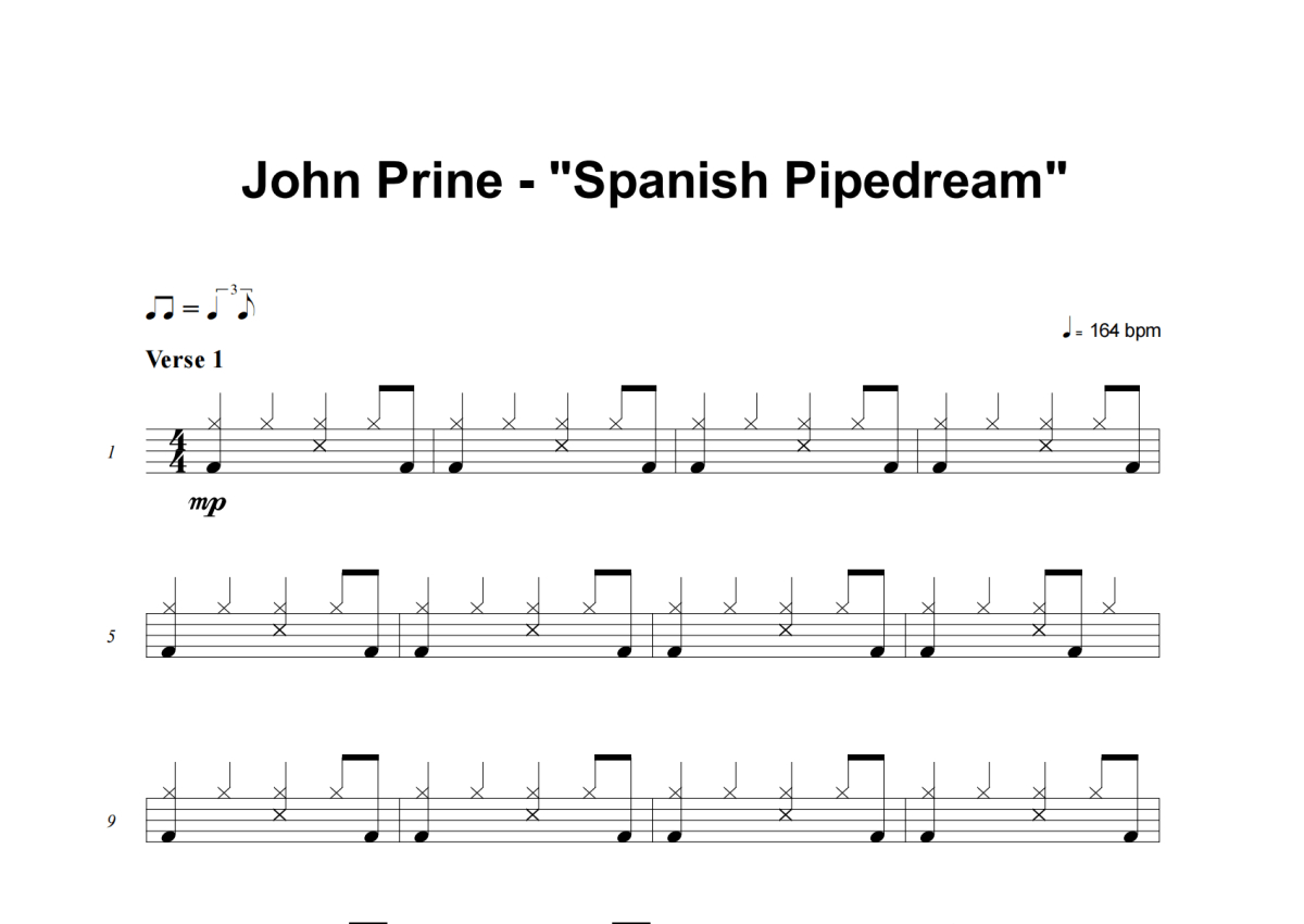《Spanish Pipedream》是John Prine演唱的一首歌曲,这份架子鼓谱共有四张高清图谱,图谱由 @积极处世 编配上传,图谱使用五线谱编配,使用这份Spanish Pipedream架子鼓谱,你将能够轻松地敲打出这首John Prine的Spanish Pipedream,快来尝试吧。