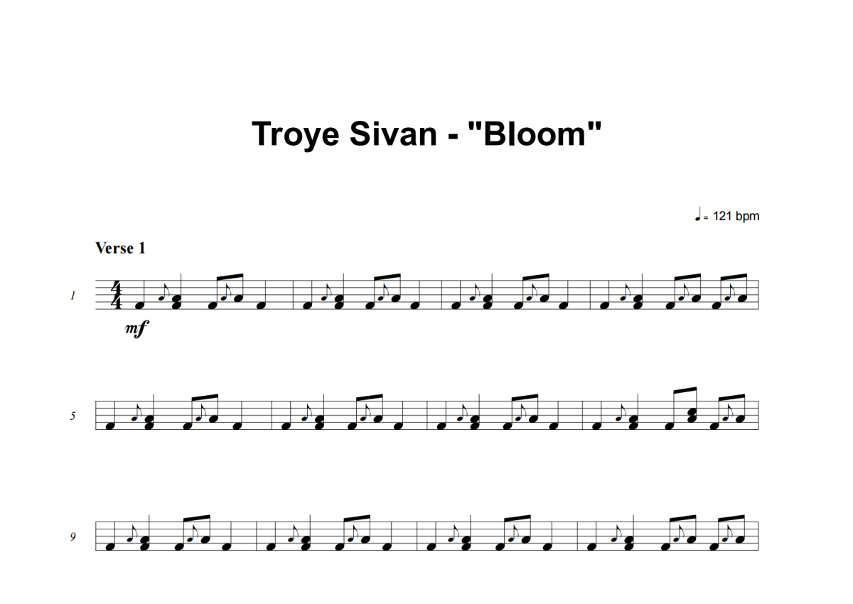 《Bloom》是Troye Sivan演唱的一首歌曲,这份架子鼓谱共有四张高清图谱,图谱由 @积极处世 编配上传,图谱使用五线谱编配,使用这份Bloom架子鼓谱,你将能够轻松地敲打出这首Troye Sivan的Bloom,快来尝试吧。