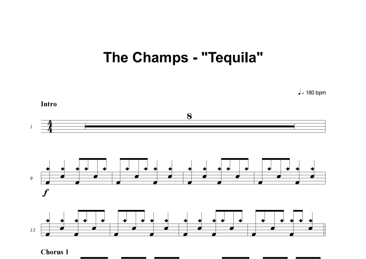 《Tequila》是The Champs演唱的一首歌曲,这份架子鼓谱共有三张高清图谱,图谱由 @积极处世 编配上传,图谱使用五线谱编配,使用这份Tequila架子鼓谱,你将能够轻松地敲打出这首The Champs的Tequila,快来尝试吧。