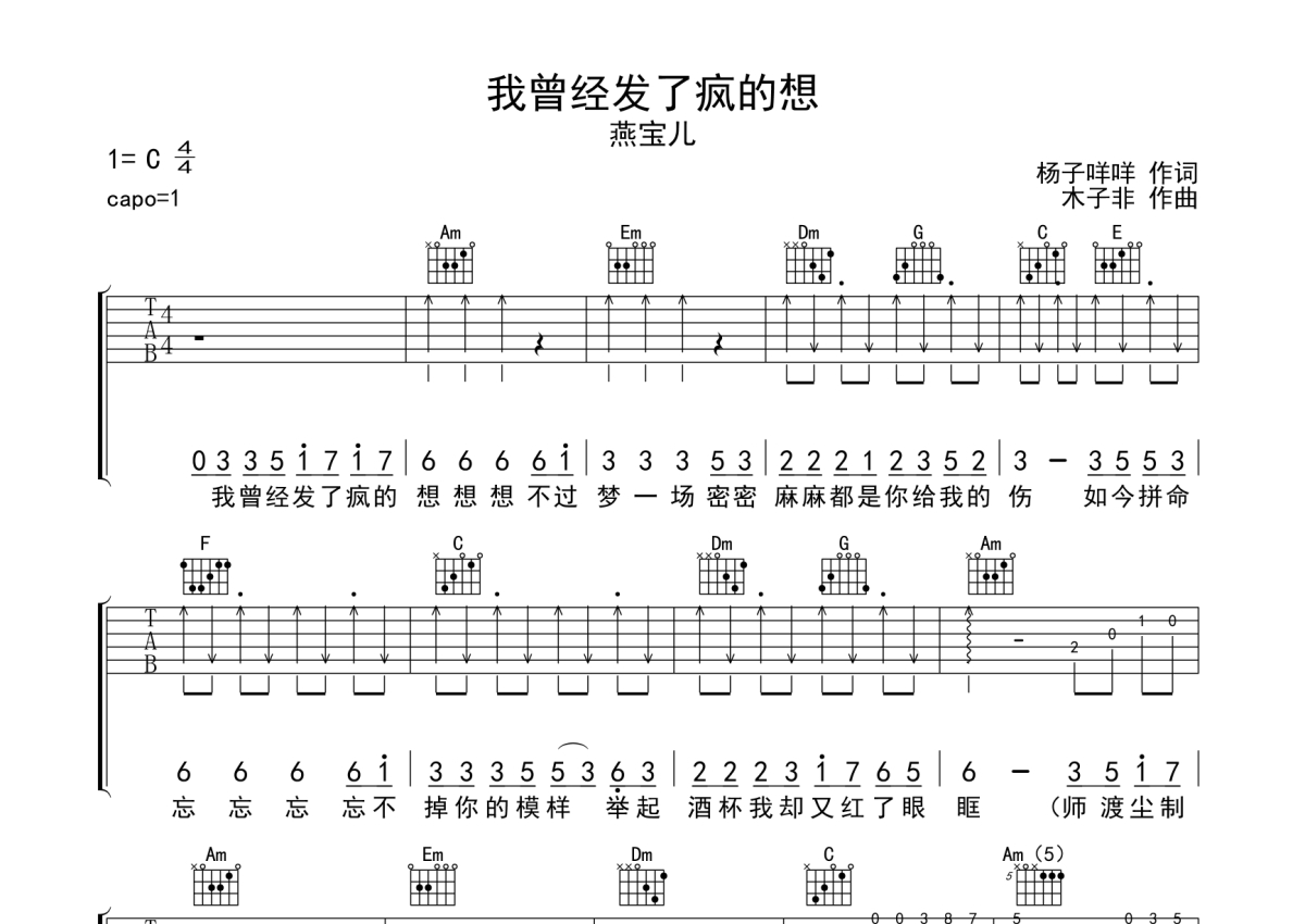 《我曾经发了疯的想》是燕宝儿演唱的一首歌曲,拍号为4/4拍,歌曲原调为C调,本吉他谱采用的是C调指法编配,变调夹1品弹奏即为原调,当然也可以根据自己的音域改变变调夹位置,或者通过改变和弦调性,以方便自己弹奏,这份吉他谱共有三张高清图谱,图谱由 @师渡尘 编配上传,图谱使用六线谱编配,包含吉他和弦指法、简谱以及歌词部分,曲谱配备了相关的视频提供浏览,使用这份我曾经发了疯的想吉他谱,可以让你更加方便地掌握这首歌曲的弹唱技巧,快来尝试吧。我曾经发了疯的想吉他谱,燕宝儿演唱,本谱采用C调指法编配,原调变调夹1品,男生建议变调夹4品,共3页。
