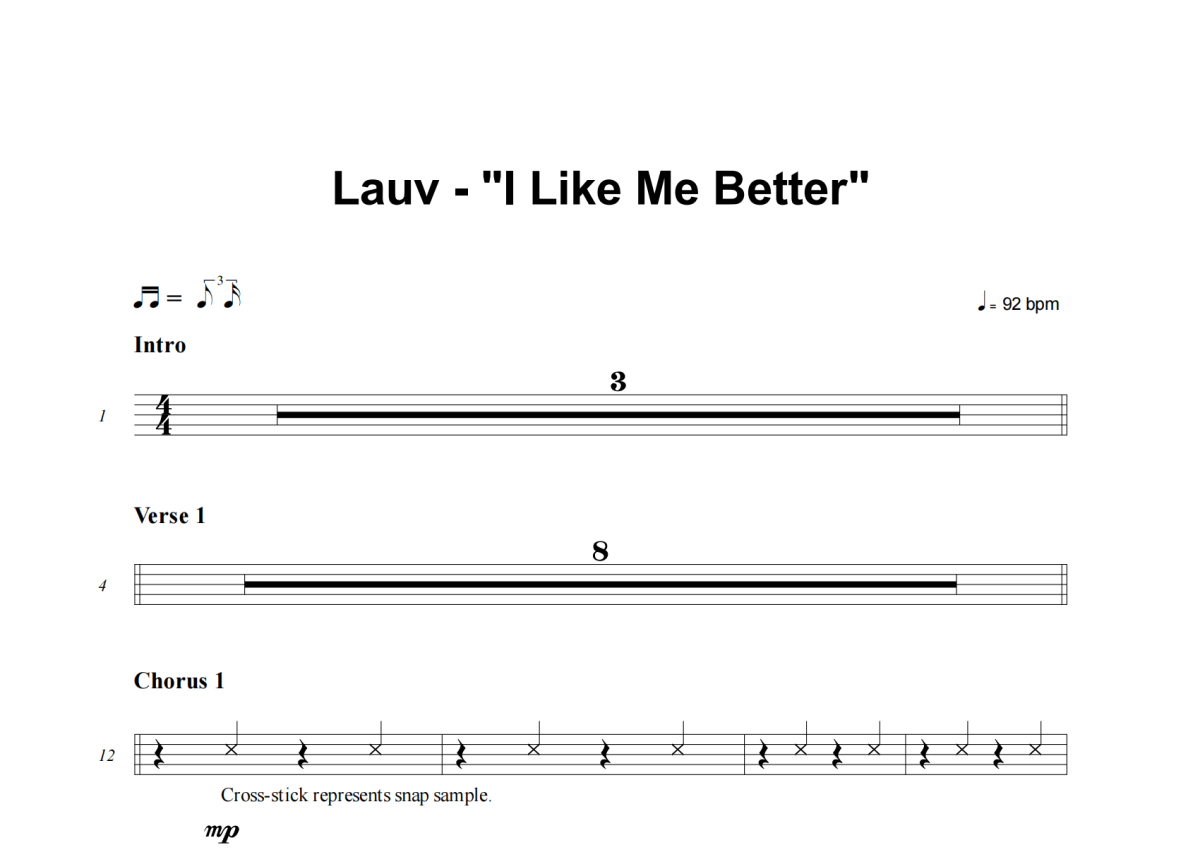 《I Like Me Better》是Lauv演唱的一首歌曲,这份架子鼓谱共有三张高清图谱,图谱由 @积极处世 编配上传,图谱使用五线谱编配,使用这份I Like Me Better架子鼓谱,你将能够轻松地敲打出这首Lauv的I Like Me Better,快来尝试吧。