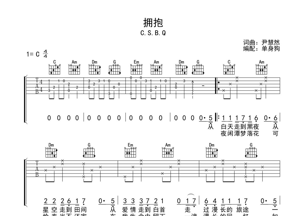 C.S.B.Q《拥抱》吉他谱 - C调弹唱六线谱