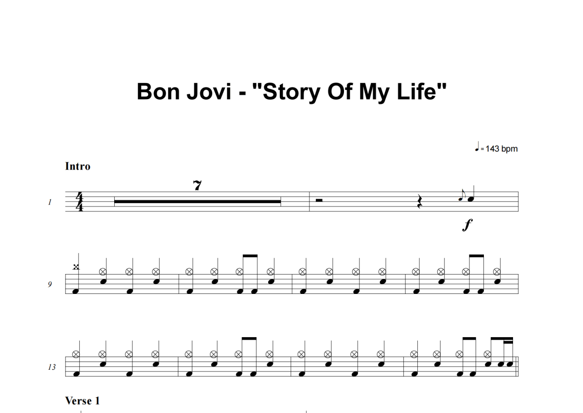 《Story Of My Life》是Bon Jovi演唱的一首歌曲,这份架子鼓谱共有四张高清图谱,图谱由 @积极处世 编配上传,图谱使用五线谱编配,使用这份Story Of My Life架子鼓谱,你将能够轻松地敲打出这首Bon Jovi的Story Of My Life,快来尝试吧。