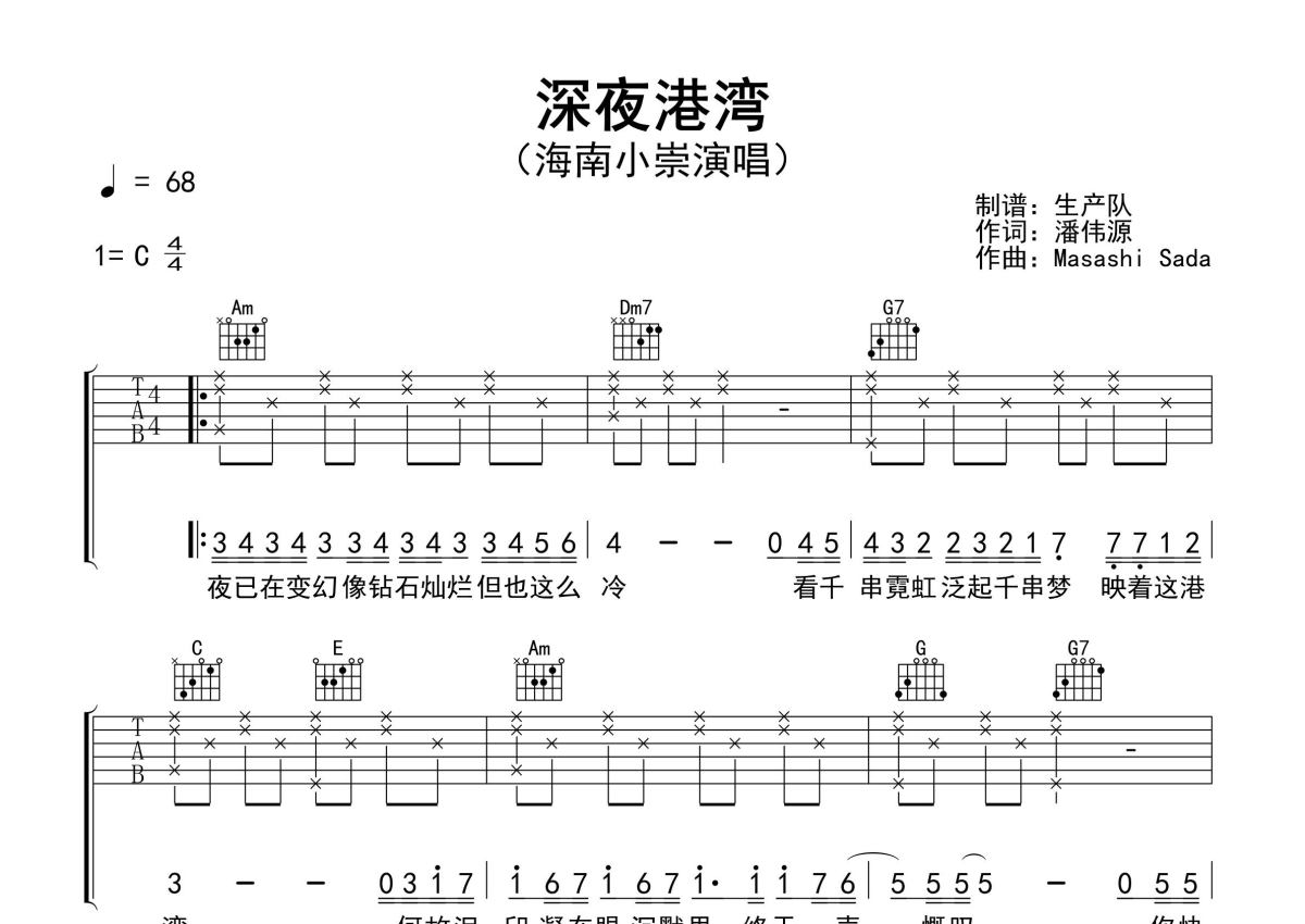 《深夜港湾》是海南小崇演唱的一首歌曲,精编民谣版,拍号为4/4拍,歌曲速度为每分钟68拍,歌曲原调为C调,本吉他谱采用的是C调指法编配,演奏时不需要使用变调夹即为原调,这份吉他谱共有两张高清图谱,图谱由 @生产队 编配上传,图谱使用六线谱编配,包含吉他和弦指法、简谱以及歌词部分,使用这份深夜港湾吉他谱,可以让你更加方便地掌握这首歌曲的弹唱技巧,快来尝试吧。海南小崇演唱的歌曲《深夜港湾》原版吉他谱,精编民谣版,值得推荐!。