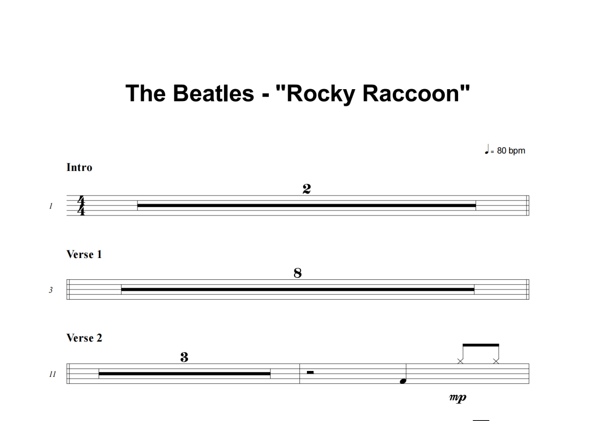 《Rocky Raccoon》是The Beatles演唱的一首歌曲,这份架子鼓谱共有三张高清图谱,图谱由 @积极处世 编配上传,图谱使用五线谱编配,使用这份Rocky Raccoon架子鼓谱,你将能够轻松地敲打出这首The Beatles的Rocky Raccoon,快来尝试吧。