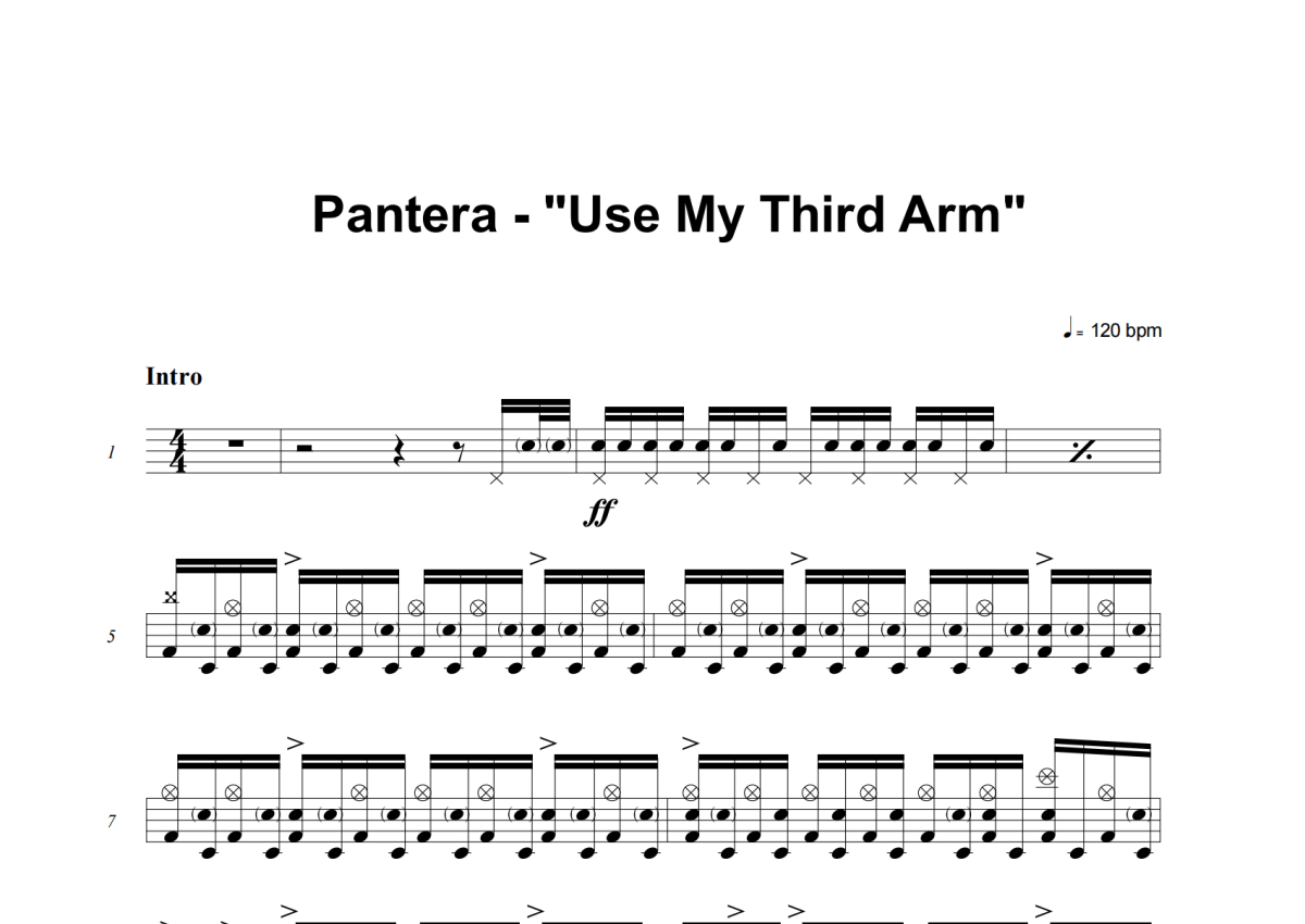 《Use My Third Arm》是Pantera演唱的一首歌曲,这份架子鼓谱共有七张高清图谱,图谱由 @积极处世 编配上传,图谱使用五线谱编配,使用这份Use My Third Arm架子鼓谱,你将能够轻松地敲打出这首Pantera的Use My Third Arm,快来尝试吧。