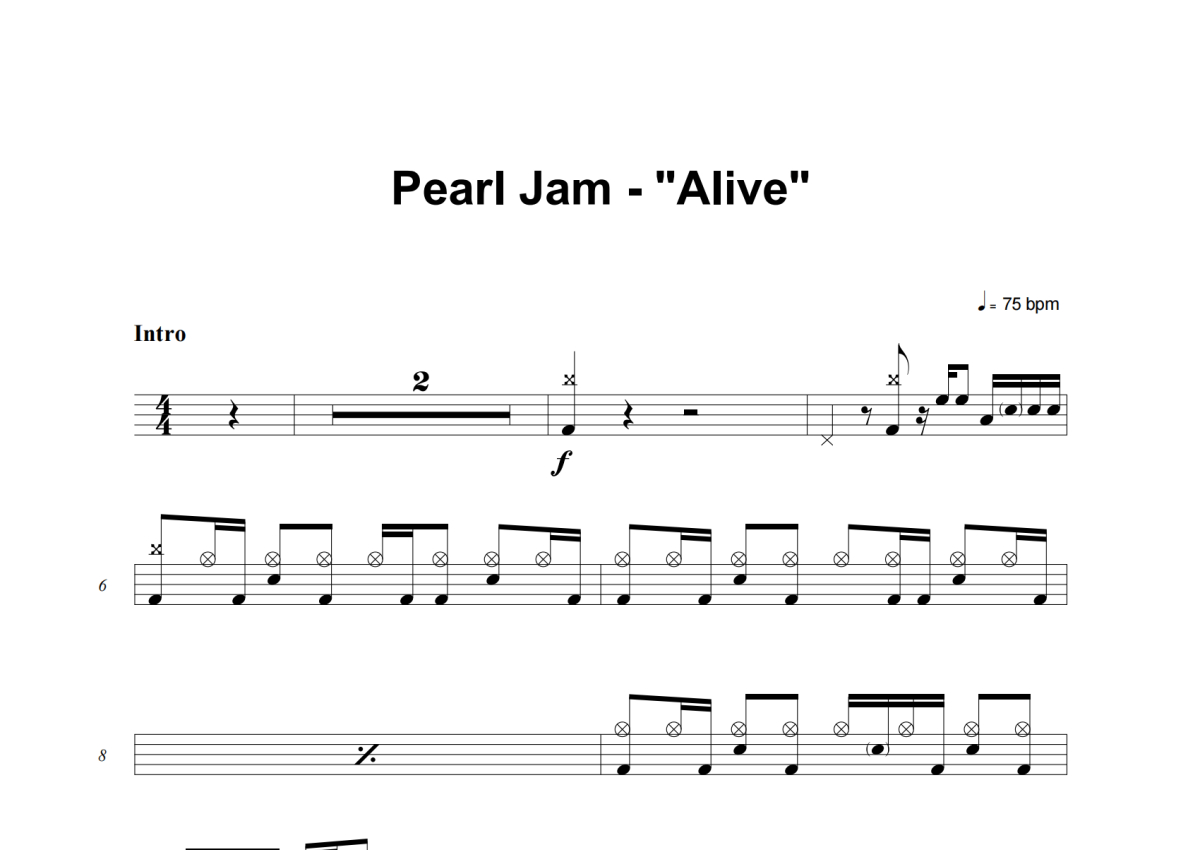 《Alive》是Pearl Jam演唱的一首歌曲,这份架子鼓谱共有六张高清图谱,图谱由 @积极处世 编配上传,图谱使用五线谱编配,使用这份Alive架子鼓谱,你将能够轻松地敲打出这首Pearl Jam的Alive,快来尝试吧。