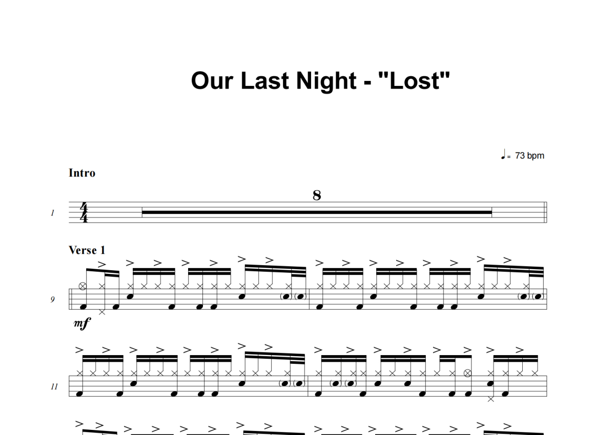 《Lost》是Our Last Night演唱的一首歌曲,这份架子鼓谱共有四张高清图谱,图谱由 @积极处世 编配上传,图谱使用五线谱编配,使用这份Lost架子鼓谱,你将能够轻松地敲打出这首Our Last Night的Lost,快来尝试吧。