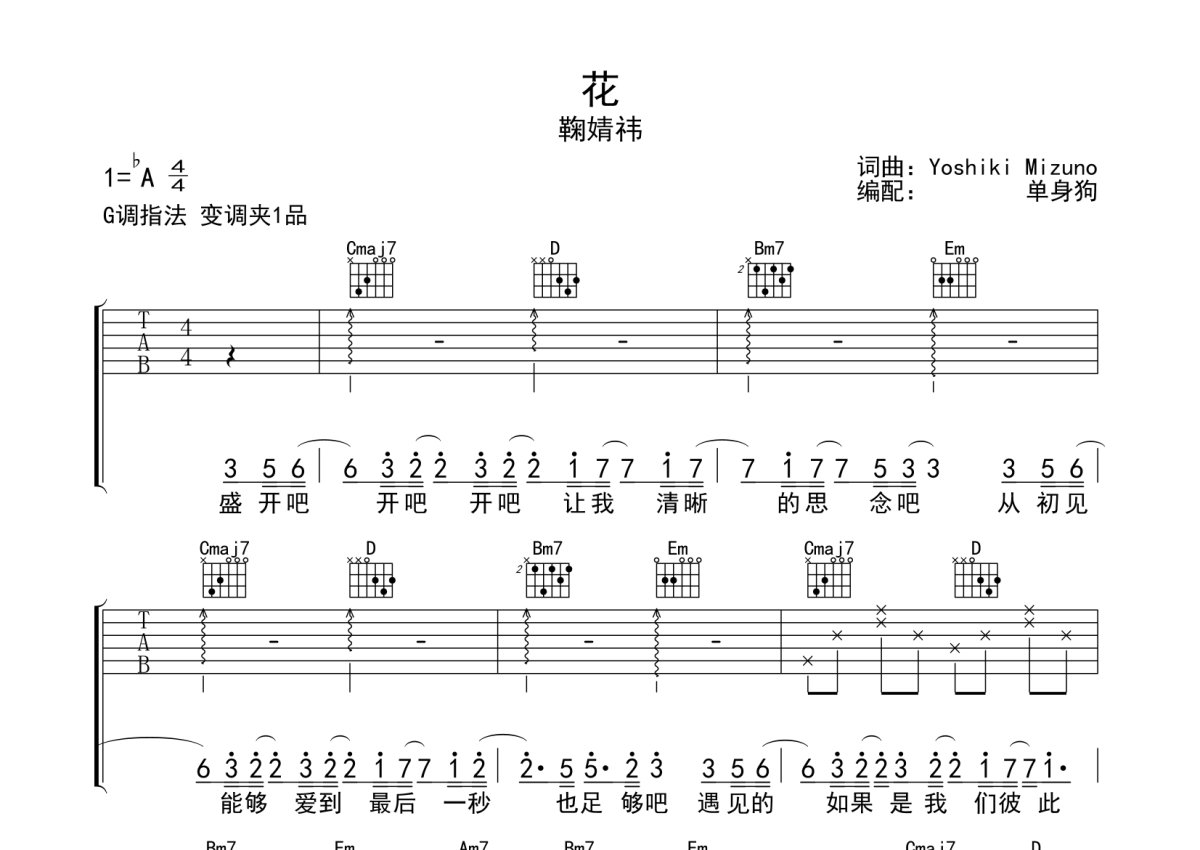 《花》是鞠婧祎演唱的一首歌曲,本吉他谱采用的是G调指法编配,这份吉他谱共有四张高清图谱,图谱由 @单身狗 编配上传,图谱使用六线谱编配,包含吉他和弦指法、简谱以及歌词部分,使用这份花吉他谱,可以让你更加方便地掌握这首歌曲的弹唱技巧,快来尝试吧。鞠婧祎《花》吉他弹唱谱,采用G调指法编配,单身狗编配出品,共有4张高清图谱。