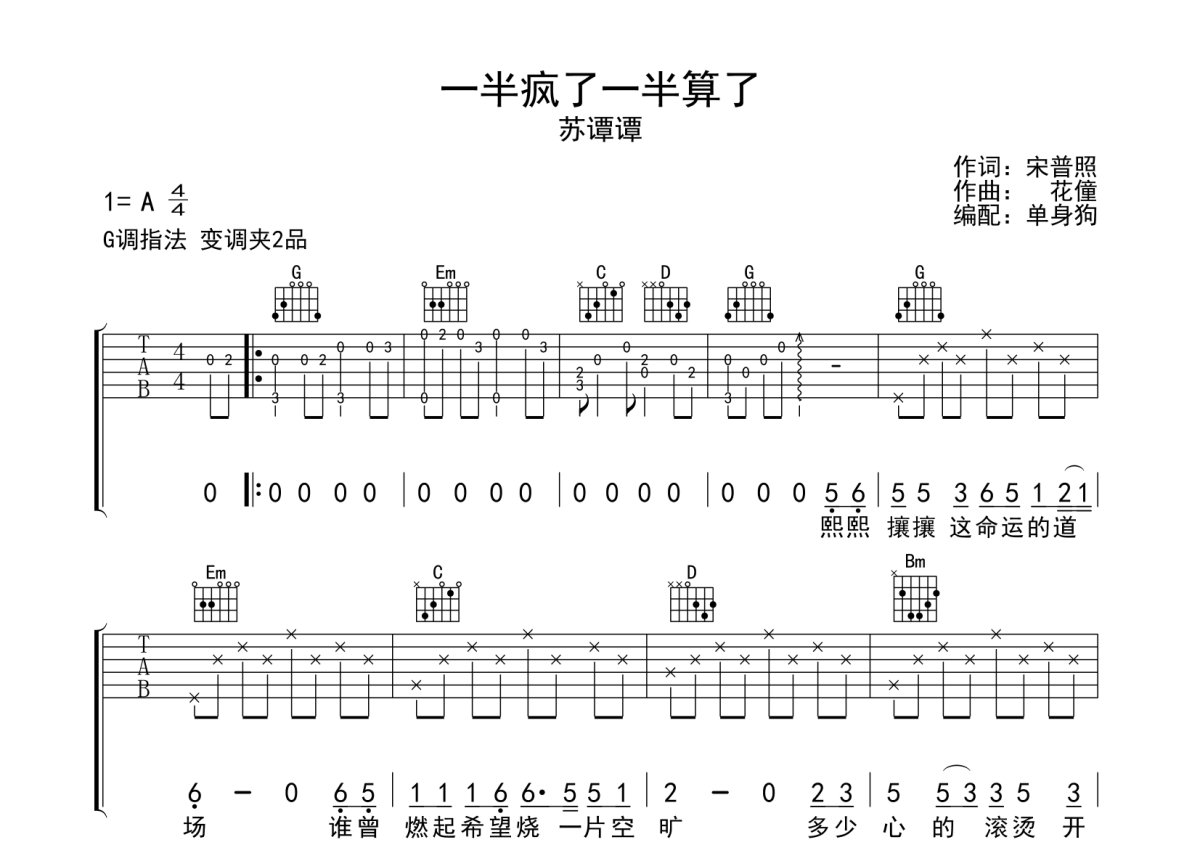 《一半疯了一半算了》是苏谭谭演唱的一首歌曲,本吉他谱采用的是G调指法编配,这份吉他谱共有三张高清图谱,图谱由 @单身狗 编配上传,图谱使用六线谱编配,包含吉他和弦指法、简谱以及歌词部分,使用这份一半疯了一半算了吉他谱,可以让你更加方便地掌握这首歌曲的弹唱技巧,快来尝试吧。苏谭谭《一半疯了一半算了》吉他弹唱谱,采用G调指法编配,单身狗编配出品,共有3张高清图谱。