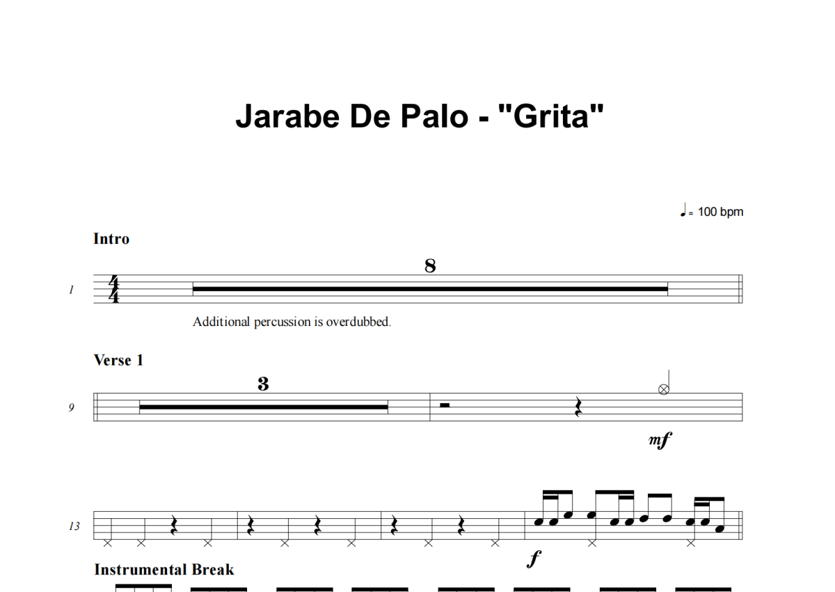 《Grita》是Jarabe De Palo演唱的一首歌曲,这份架子鼓谱共有三张高清图谱,图谱由 @积极处世 编配上传,图谱使用五线谱编配,使用这份Grita架子鼓谱,你将能够轻松地敲打出这首Jarabe De Palo的Grita,快来尝试吧。