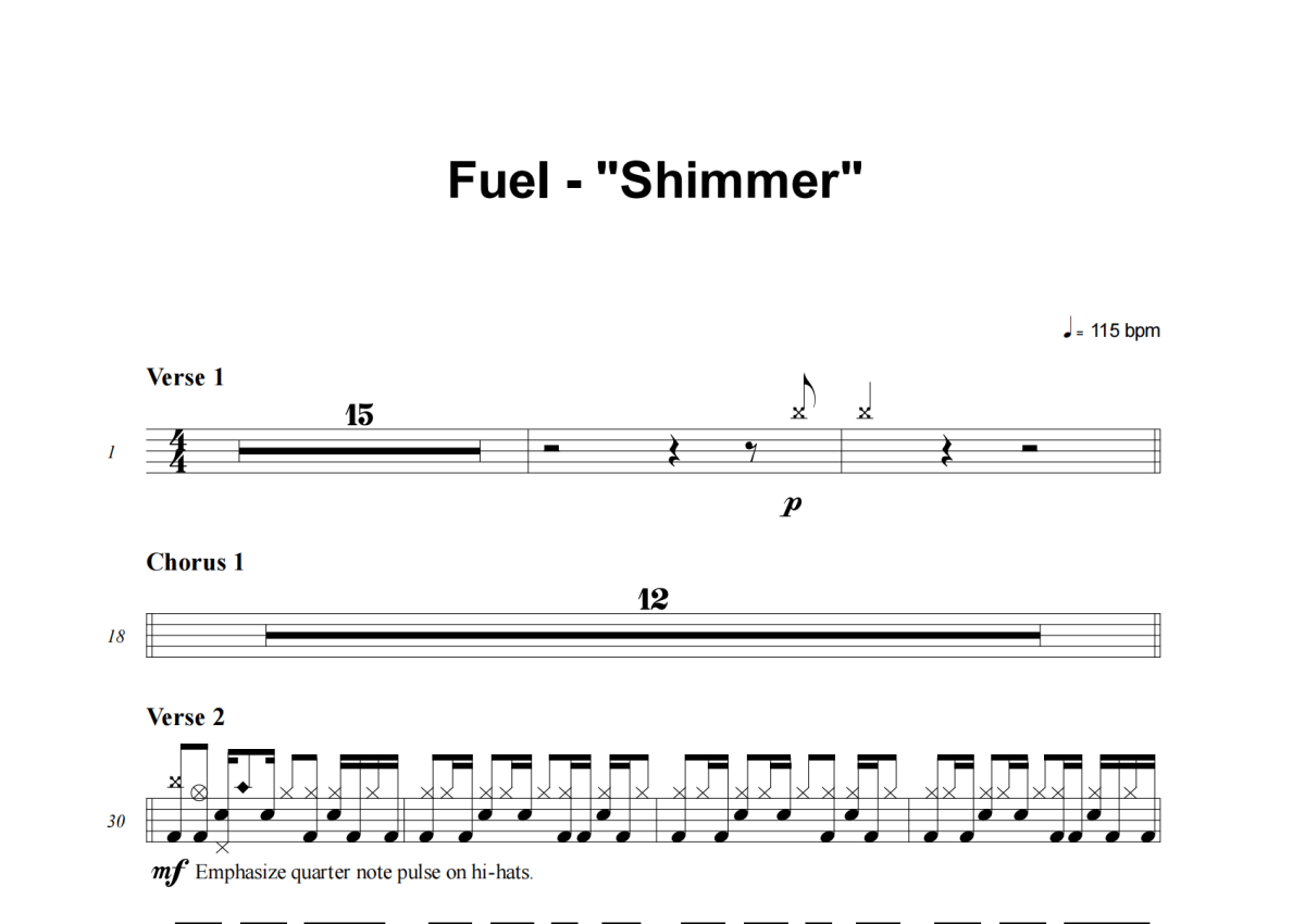 《Shimmer》是Fuel演唱的一首歌曲,这份架子鼓谱共有三张高清图谱,图谱由 @积极处世 编配上传,图谱使用五线谱编配,使用这份Shimmer架子鼓谱,你将能够轻松地敲打出这首Fuel的Shimmer,快来尝试吧。