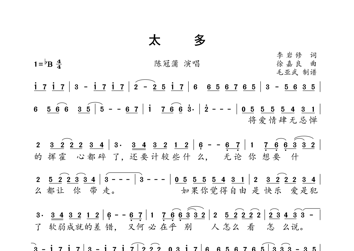 《太多》是陈冠蒲演唱的一首歌曲,这份简谱共有一张高清图谱,图谱由 @秋天的童话 编配上传。