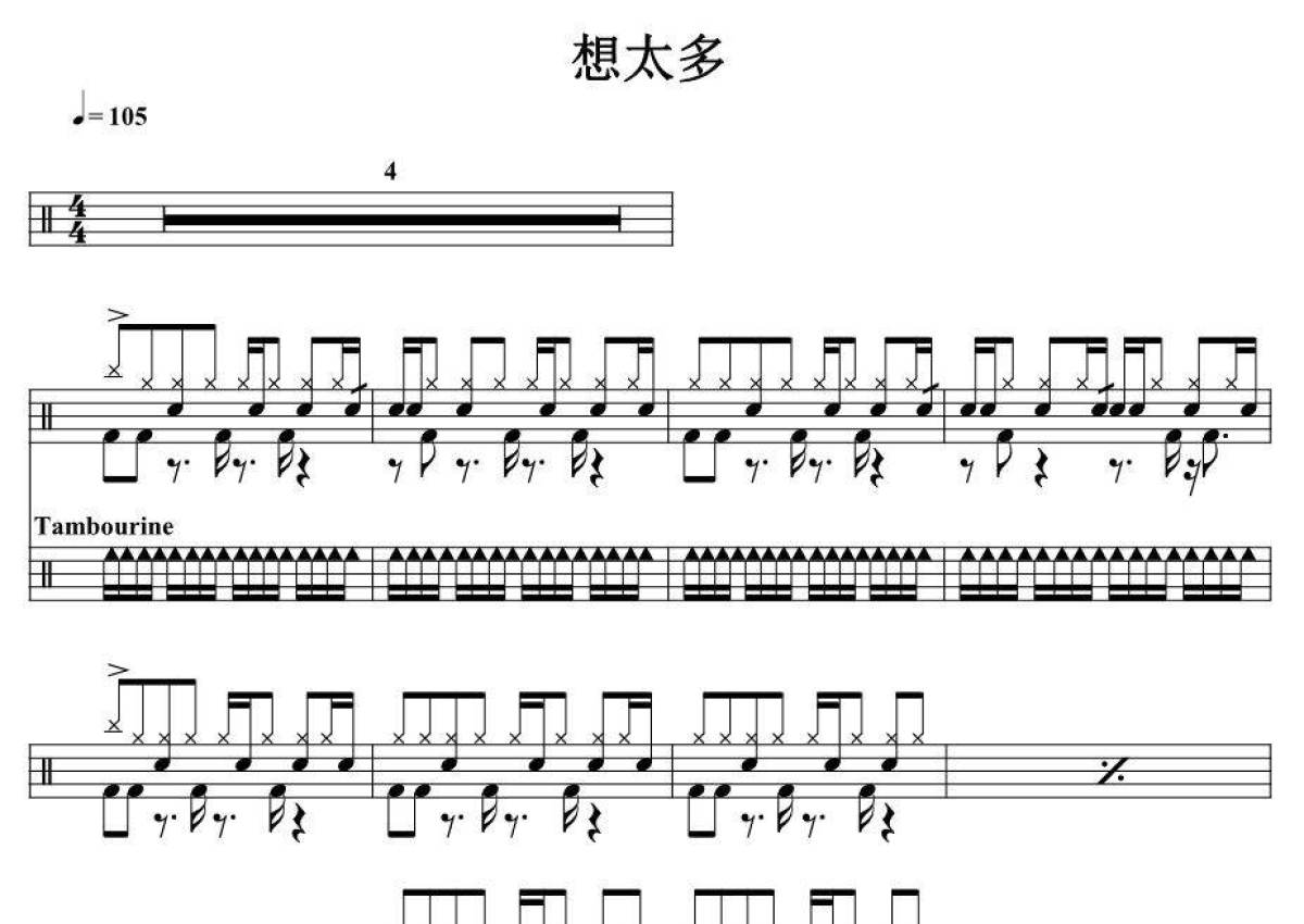 《想太多》是张震岳演唱的一首歌曲,拍号为4/4拍,歌曲速度为每分钟105拍,这份架子鼓谱共有五张高清图谱,图谱由 @音符喷血者 编配上传,图谱使用五线谱编配,使用这份想太多架子鼓谱,你将能够轻松地敲打出这首张震岳的想太多,快来尝试吧。