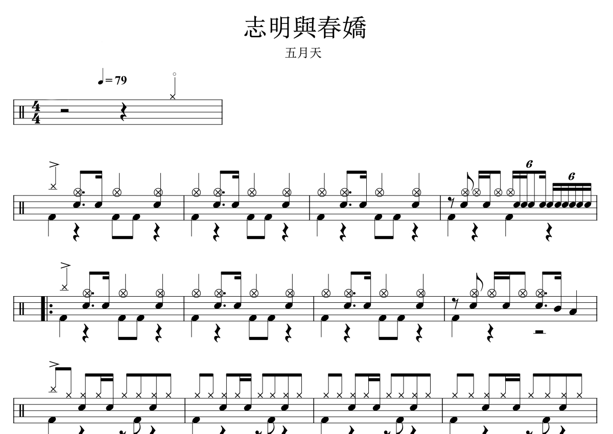 《志明与春娇》是五月天演唱的一首歌曲,拍号为4/4拍,歌曲速度为每分钟79拍,这份架子鼓谱共有三张高清图谱,图谱由 @音符喷血者 编配上传,图谱使用五线谱编配,使用这份志明与春娇架子鼓谱,你将能够轻松地敲打出这首五月天的志明与春娇,快来尝试吧。