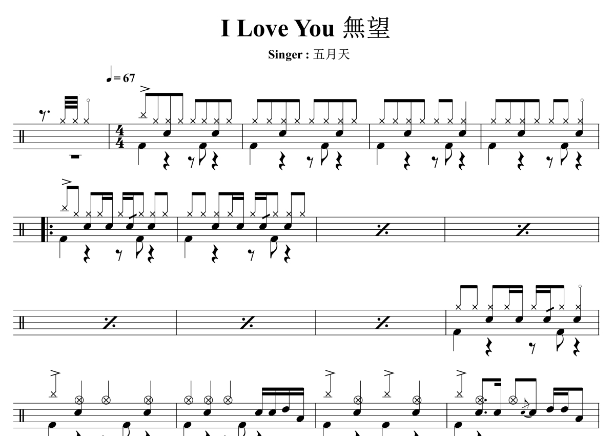 《I Love You 無望》是五月天演唱的一首歌曲,拍号为4/4拍,歌曲速度为每分钟67拍,这份架子鼓谱共有两张高清图谱,图谱由 @音符喷血者 编配上传,图谱使用五线谱编配,使用这份I Love You 無望架子鼓谱,你将能够轻松地敲打出这首五月天的I Love You 無望,快来尝试吧。