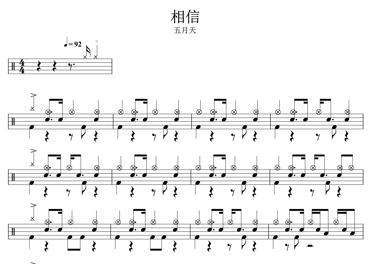 《相信》是五月天演唱的一首歌曲,拍号为4/4拍,歌曲速度为每分钟92拍,这份架子鼓谱共有四张高清图谱,图谱由 @音符喷血者 编配上传,图谱使用五线谱编配,使用这份相信架子鼓谱,你将能够轻松地敲打出这首五月天的相信,快来尝试吧。