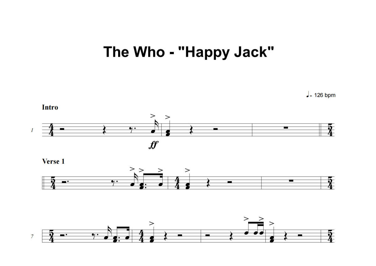 《Happy Jack》是The Who演唱的一首歌曲,这份架子鼓谱共有三张高清图谱,图谱由 @积极处世 编配上传,图谱使用五线谱编配,使用这份Happy Jack架子鼓谱,你将能够轻松地敲打出这首The Who的Happy Jack,快来尝试吧。