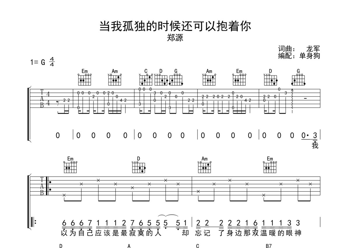 郑源《当我孤独的时候还可以抱着你》吉他谱 - G调弹唱六线谱