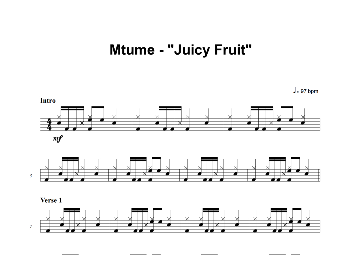 《Juicy Fruit》是Mtume演唱的一首歌曲,这份架子鼓谱共有四张高清图谱,图谱由 @积极处世 编配上传,图谱使用五线谱编配,使用这份Juicy Fruit架子鼓谱,你将能够轻松地敲打出这首Mtume的Juicy Fruit,快来尝试吧。