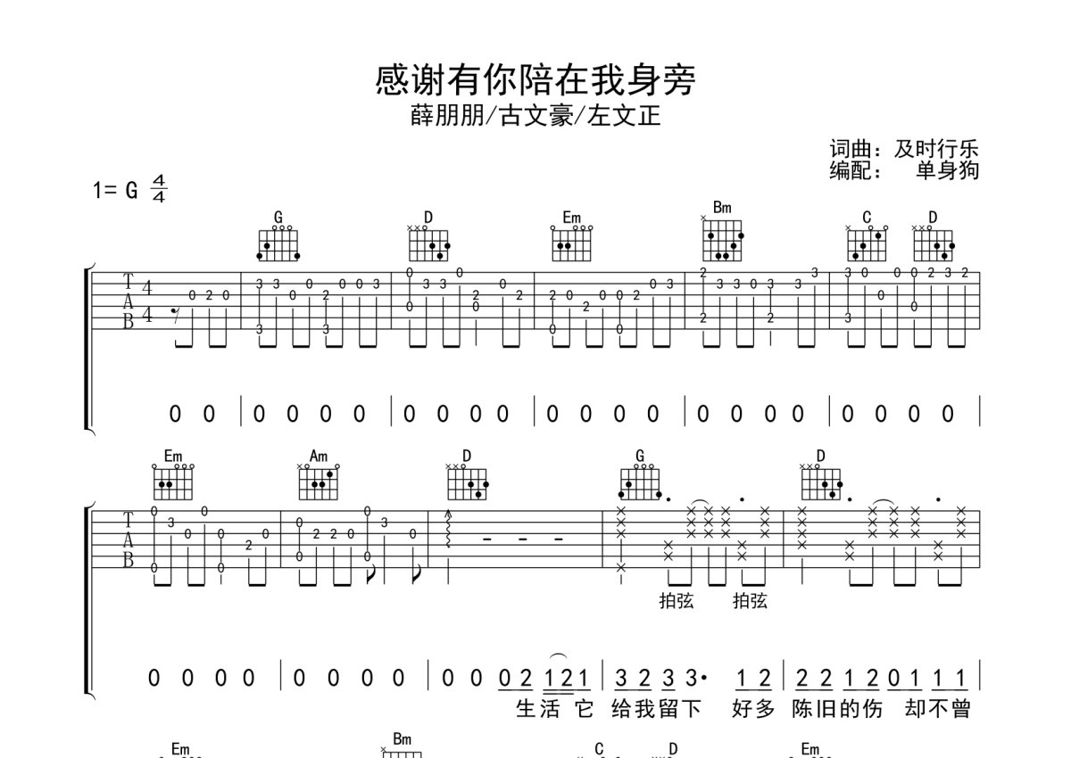 薛朋朋/古文豪/左文正《感谢有你陪在我身旁》吉他谱 - G调弹唱六线谱