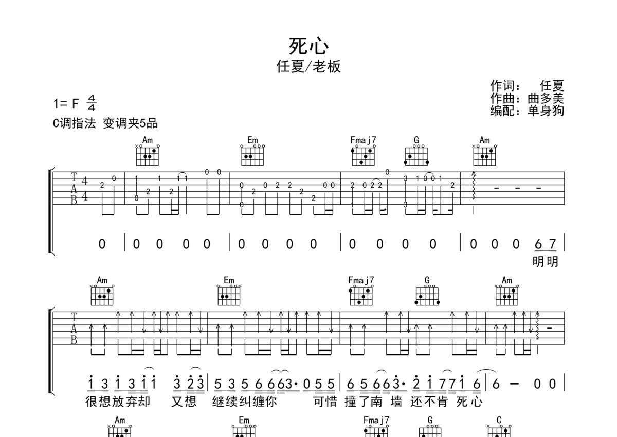 任夏/老板《死心》吉他谱 - C调弹唱六线谱