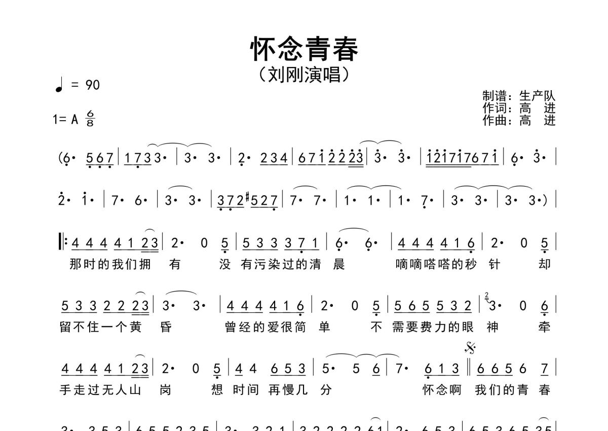 《怀念青春》是刘刚演唱的一首歌曲,原版简谱,拍号为6/8拍,歌曲速度为每分钟90拍,这份简谱共有一张高清图谱,图谱由 @生产队 编配上传刘刚演唱的经典歌曲《怀念青春》原版简谱,含前奏、间奏、尾奏solo编配,精编完美版,怀旧经典!。