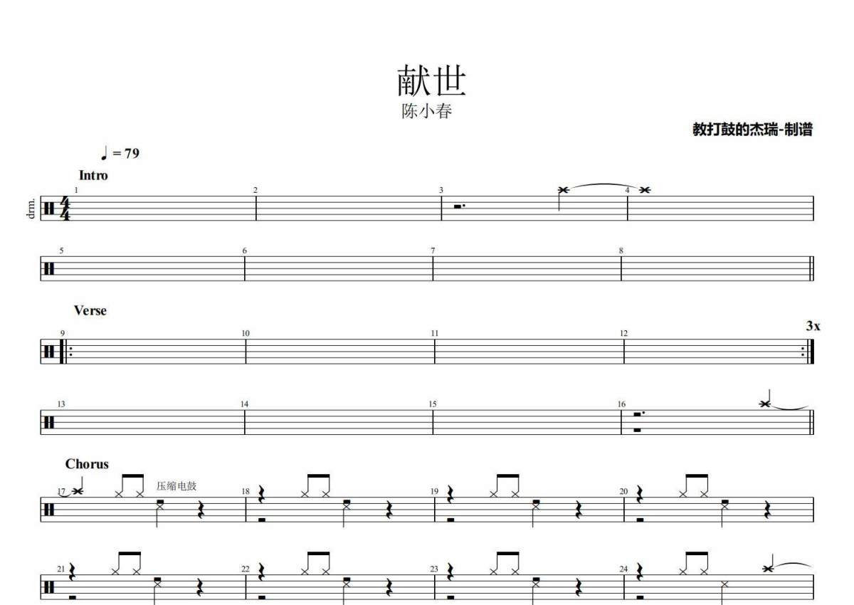 《献世》是陈小春演唱的一首歌曲,拍号为4/4拍,歌曲速度为每分钟79拍,这份架子鼓谱共有两张高清图谱,图谱由 @Jerry 编配上传,图谱使用五线谱编配,使用这份献世架子鼓谱,你将能够轻松地敲打出这首陈小春的献世,快来尝试吧。