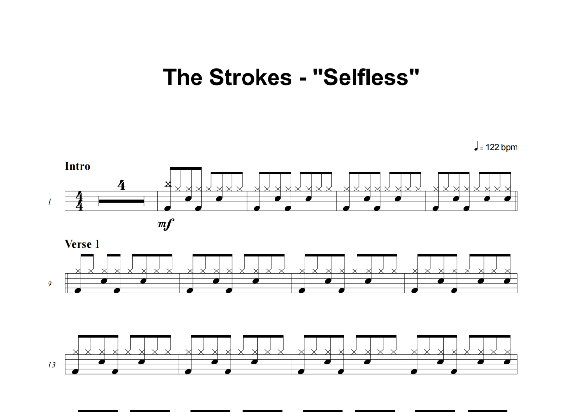 《Selfless》是The Strokes演唱的一首歌曲,这份架子鼓谱共有三张高清图谱,图谱由 @积极处世 编配上传,图谱使用五线谱编配,使用这份Selfless架子鼓谱,你将能够轻松地敲打出这首The Strokes的Selfless,快来尝试吧。