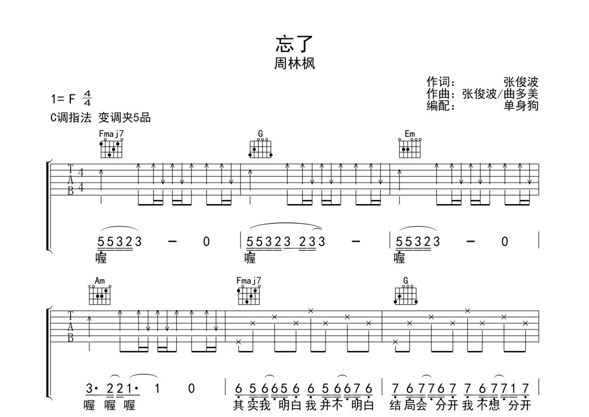 周林枫《忘了》吉他谱 - C调弹唱六线谱
