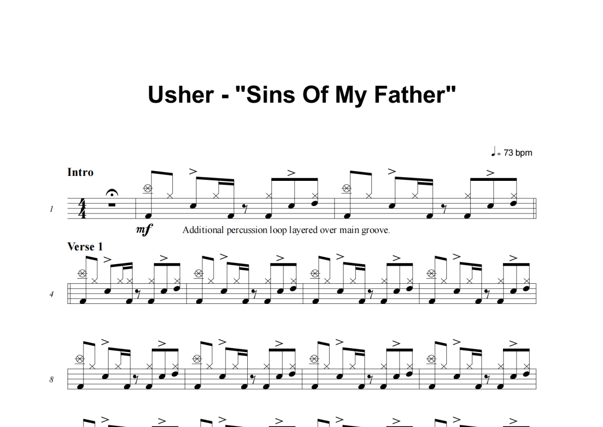 《Sins Of My Father》是Usher演唱的一首歌曲,这份架子鼓谱共有三张高清图谱,图谱由 @积极处世 编配上传,图谱使用五线谱编配,使用这份Sins Of My Father架子鼓谱,你将能够轻松地敲打出这首Usher的Sins Of My Father,快来尝试吧。