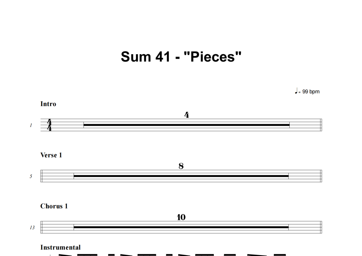 《Pieces》是Sum 41演唱的一首歌曲,这份架子鼓谱共有三张高清图谱,图谱由 @积极处世 编配上传,图谱使用五线谱编配,使用这份Pieces架子鼓谱,你将能够轻松地敲打出这首Sum 41的Pieces,快来尝试吧。