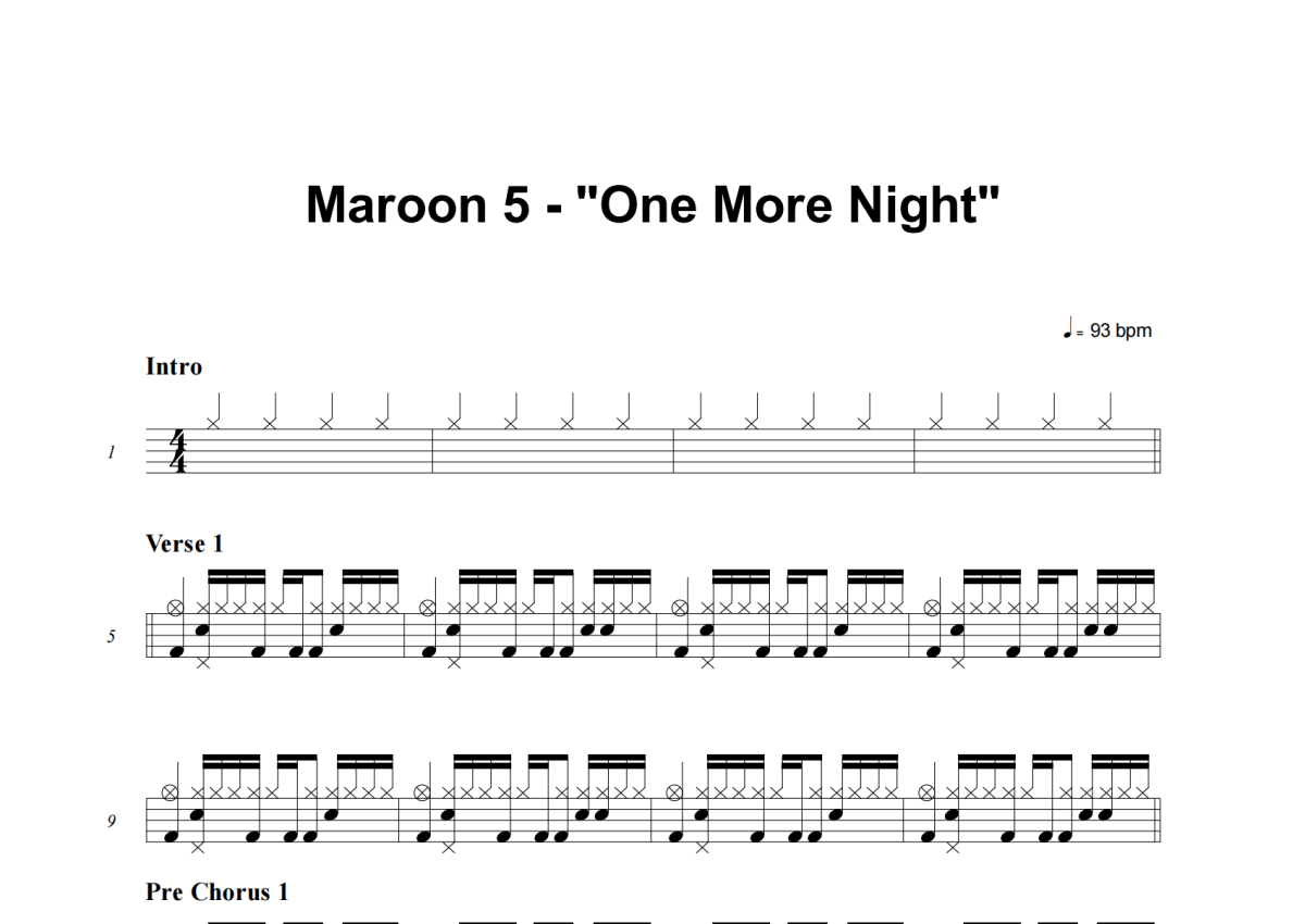 Maroon 5《One More Night》架子鼓谱