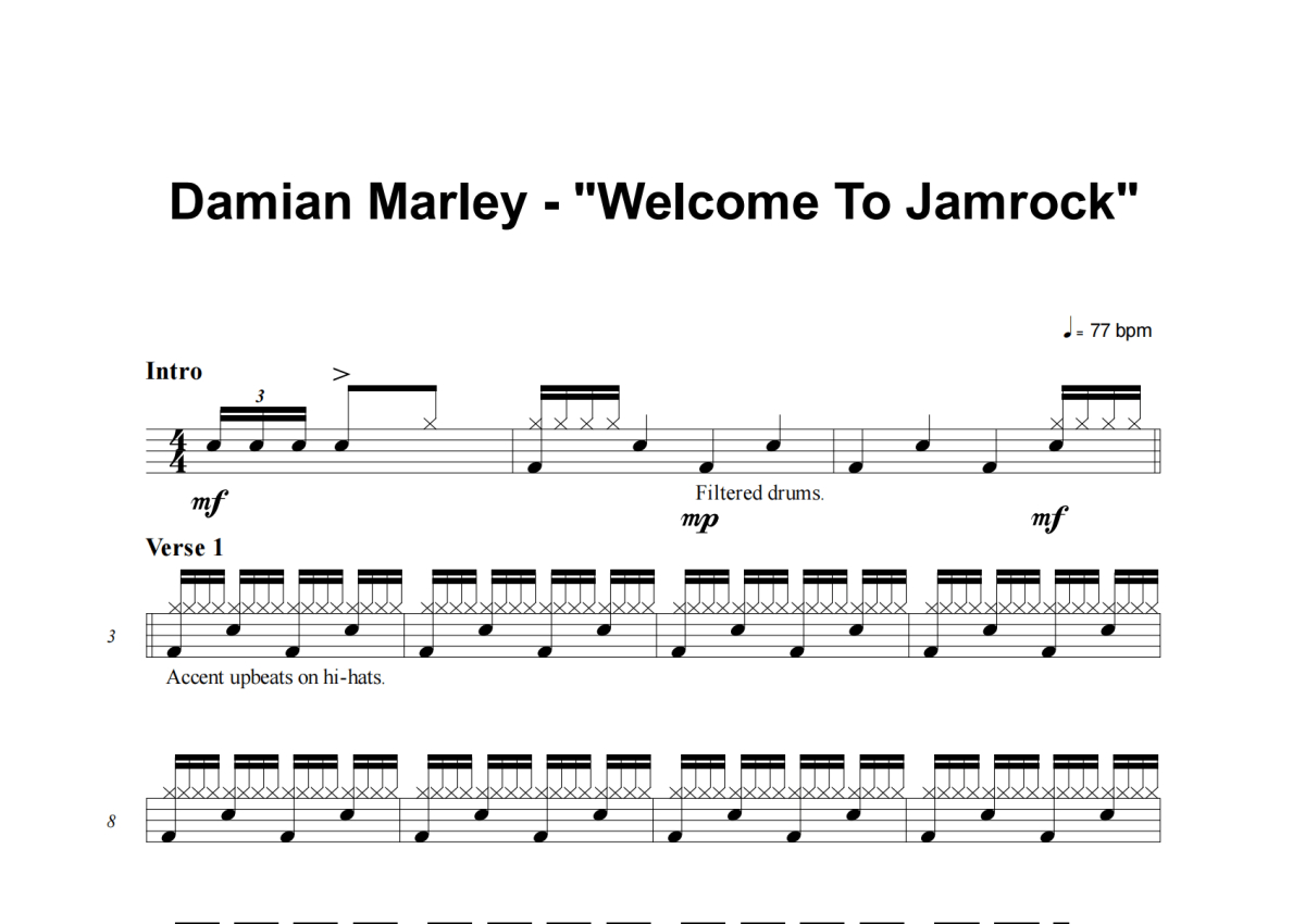 《Welcome To Jamrock》是Damian Marley演唱的一首歌曲,这份架子鼓谱共有三张高清图谱,图谱由 @积极处世 编配上传,图谱使用五线谱编配,使用这份Welcome To Jamrock架子鼓谱,你将能够轻松地敲打出这首Damian Marley的Welcome To Jamrock,快来尝试吧。