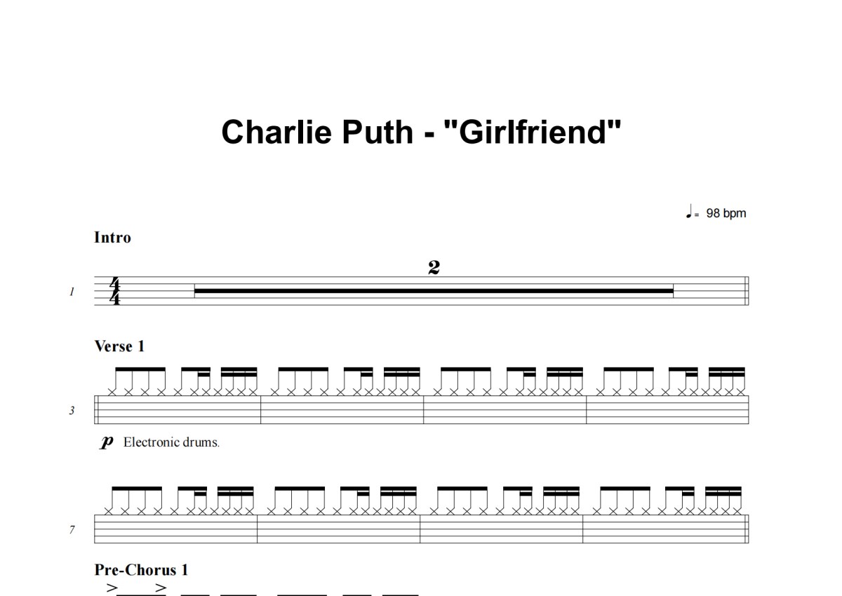 Charlie Puth《Girlfriend》架子鼓谱