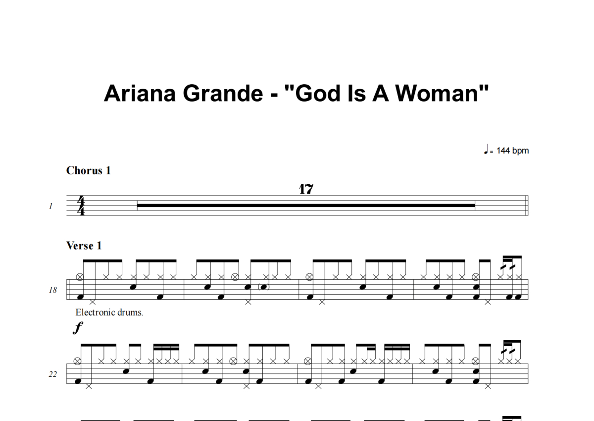 《God Is A Woman》是Ariana Grande演唱的一首歌曲,这份架子鼓谱共有三张高清图谱,图谱由 @积极处世 编配上传,图谱使用五线谱编配,使用这份God Is A Woman架子鼓谱,你将能够轻松地敲打出这首Ariana Grande的God Is A Woman,快来尝试吧。