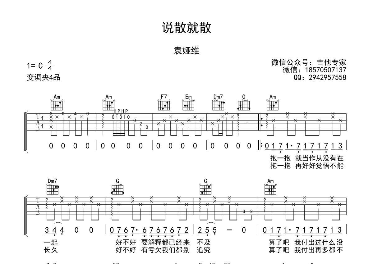 《说散就散》是袁娅维演唱的一首歌曲,本吉他谱采用的是C调指法编配,这份吉他谱共有两张高清图谱,图谱由 @吉他专家 编配上传,图谱使用六线谱编配,包含吉他和弦指法、简谱以及歌词部分,使用这份说散就散吉他谱,可以让你更加方便地掌握这首歌曲的弹唱技巧,快来尝试吧。电影《前任3:再见前任》的主题曲,让人听一遍就爱上了。喜欢听的无非就是唱出了自己隐藏内心想表达的想法吧,网上男女声翻唱的版本也很多,一段用情至深的感情,伴随着消失殆尽的新鲜感,难逃遗憾收场,饱含感情的声音唱出了暗涌的情绪,唱出了爱人之间的折磨纠缠,更触动了每一位有故事的人。