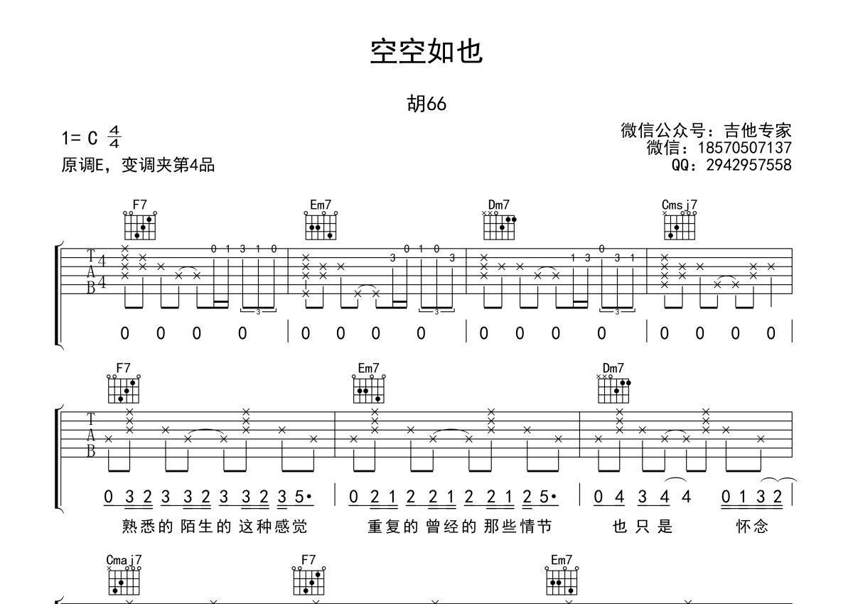 《空空如也》是胡66演唱的一首歌曲,本吉他谱采用的是C调指法编配,这份吉他谱共有两张高清图谱,图谱由 @吉他专家 编配上传,图谱使用六线谱编配,包含吉他和弦指法、简谱以及歌词部分,使用这份空空如也吉他谱,可以让你更加方便地掌握这首歌曲的弹唱技巧,快来尝试吧。原调E选C调变调夹夹四品,男生根据自己音高适当使用变调夹升降八度调整。