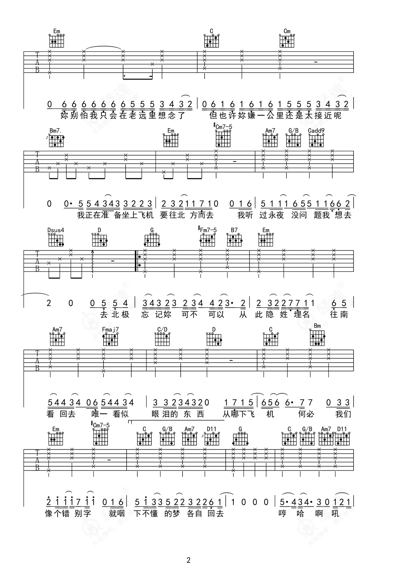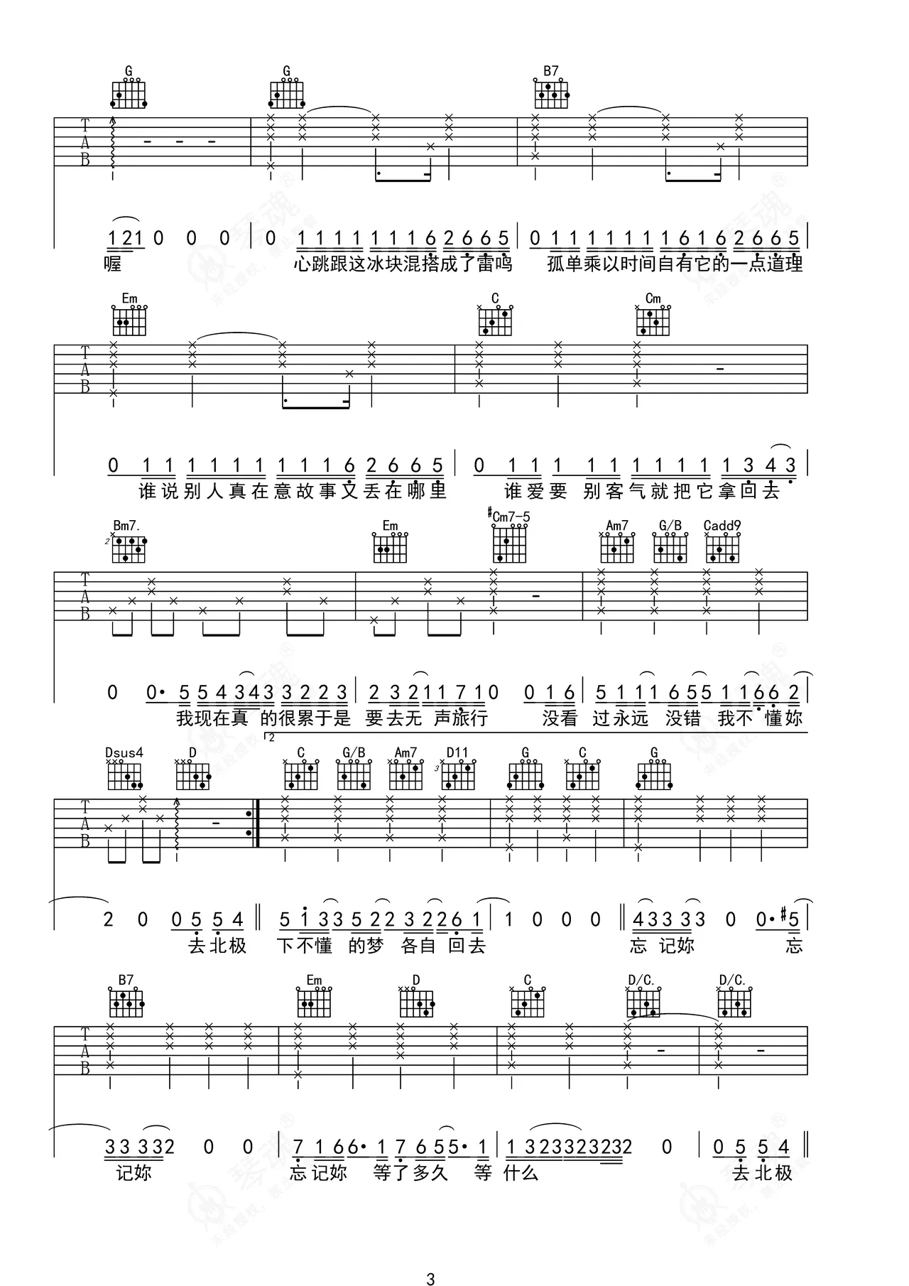 《去北极忘记你》是Gareth.T演唱的一首歌曲,这份吉他谱共有四张高清图谱,图谱由 @ 编配上传,图谱使用六线谱编配,包含吉他和弦指法、简谱以及歌词部分,使用这份去北极忘记你吉他谱,可以让你更加方便地掌握这首歌曲的弹唱技巧,快来尝试吧。