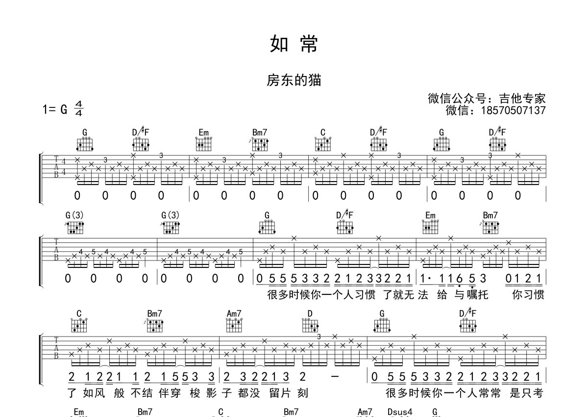 房东的猫《如常》吉他谱 - G调弹唱六线谱